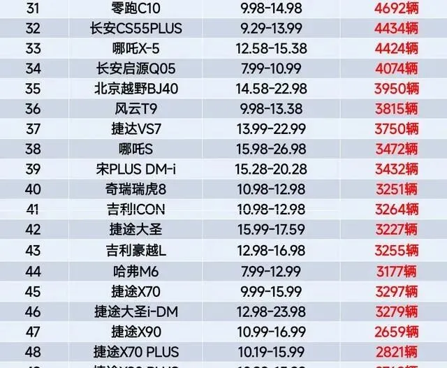 还有些车型虽然排名靠后点,但各有各的受众。比如捷途旅行者二十四名,五千多辆,方盒子造型吸粉户外党;哪吒X-5三十三名,四千多辆,价格亲民,年轻人第一台SUV的好选择;宋PLUS新能源三十名,四千七百多辆,插混车型,没有续航焦虑,城里用电、长途用油,灵活得很;北京越野BJ40雷霆二十一,六千多辆,硬派越野迷的心头好,非铺装路面如履平地。