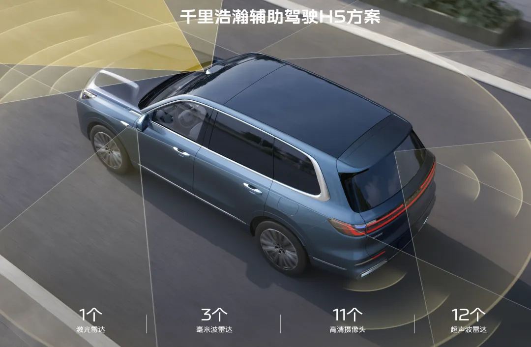 高配车型配备“千里浩瀚H5”智驾系统,硬件搭载了1颗激光雷达 + 11颗高清摄像头 + 3颗毫米波雷达,共27个传感器,算力达1016TOPS1颗激光雷达 + 11颗高清摄像头 + 3颗毫米波雷达,共27个传感器,算力达1016TOPS。