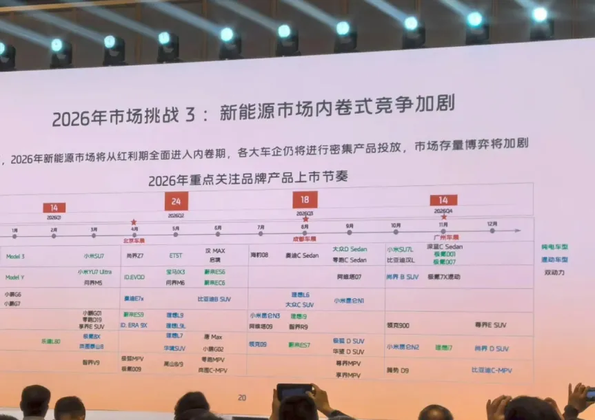 同时,在某车企无意中透露出的“友商新品发布节奏”图中也表明,2026年,小米在增程领域会有代号昆仑N1、昆仑N2、昆仑N3三款车型,分别在下半年集中上市。纯电领域则有新一代小米SU7、小米YU7 Ultra、小米SU7L。当然,这张图也只是仅供参考,并不完全准确。