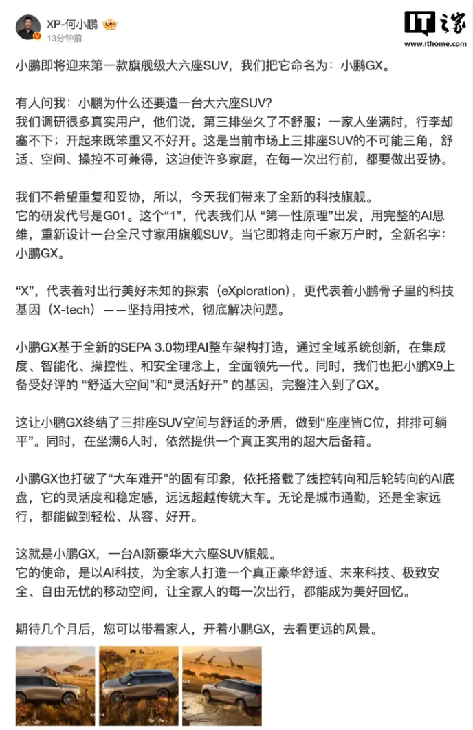2 月 5 日消息,今天上午,小鹏汽车创始人何小鹏在微博发布长文,官宣将发布 AI 新豪华大六座旗舰 SUV—— 小鹏 GX。