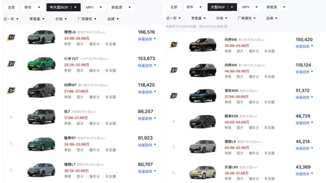 问界M9这种爆款,一个月能卖出一万好几,跟印钱似的。蔚来ES8、吉利银河M9这些,销量也蹭蹭往上窜。它们成功地从GL8、腾势D9这些老牌MPV嘴里,硬生生抢下了一大块肉。