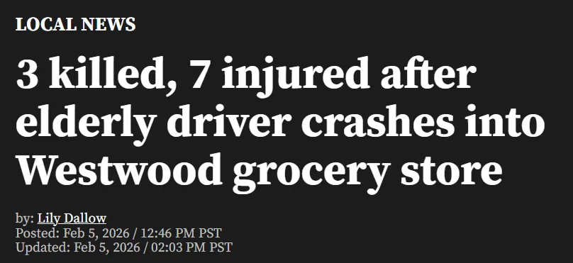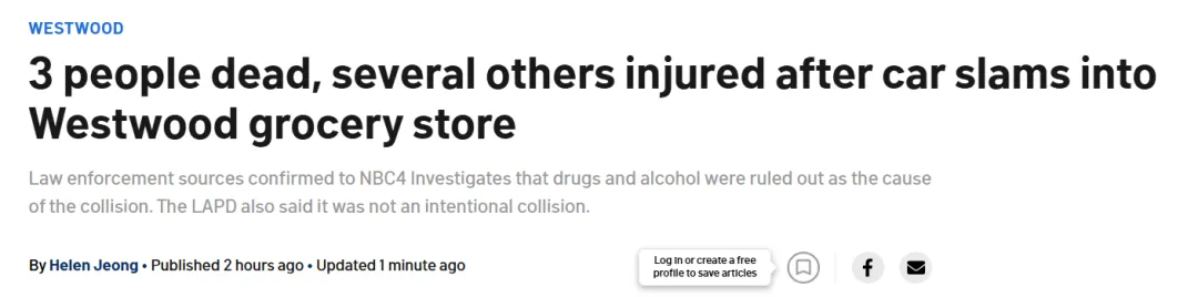 洛杉矶华人资讯网2月5日综合报道 当地官员表示,2月5日周四下午,洛杉矶西木区(Westwood)发生一起车辆冲入中国超市的严重事故,已造成至少3人死亡、多人受伤。