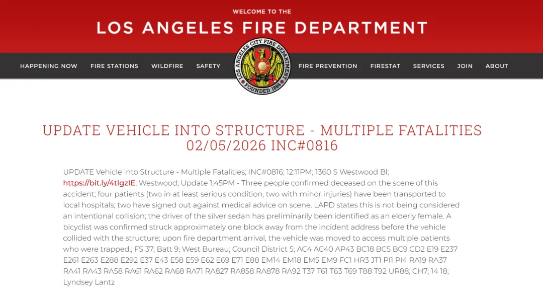 LAFD在下午2点左右发布的最新通报称:2名伤者情况严重、2人受轻伤,另有2人在现场签字拒绝医疗救治。警方同时确认,遇难及受伤者均非UCLA学生。