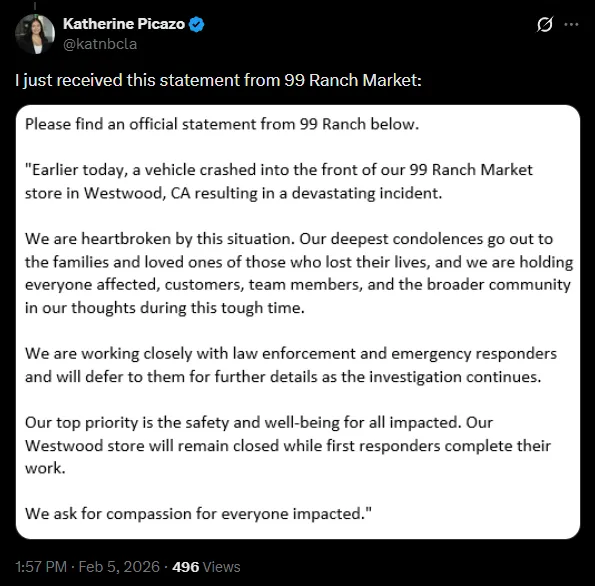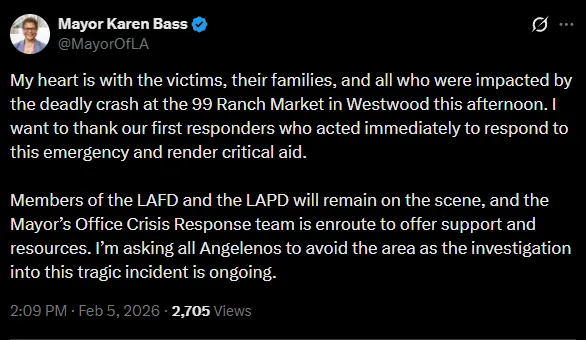 洛杉矶市长凯伦·巴斯(Karen Bass)在一份声明中表示,洛杉矶警察局、洛杉矶消防局以及市长办公室的危机应对小组将继续留在现场处理善后工作。她说:“我向今天下午发生在99 Ranch Market超市的致命车祸受害者、他们的家属以及所有受到影响的人致以最深切的慰问。”