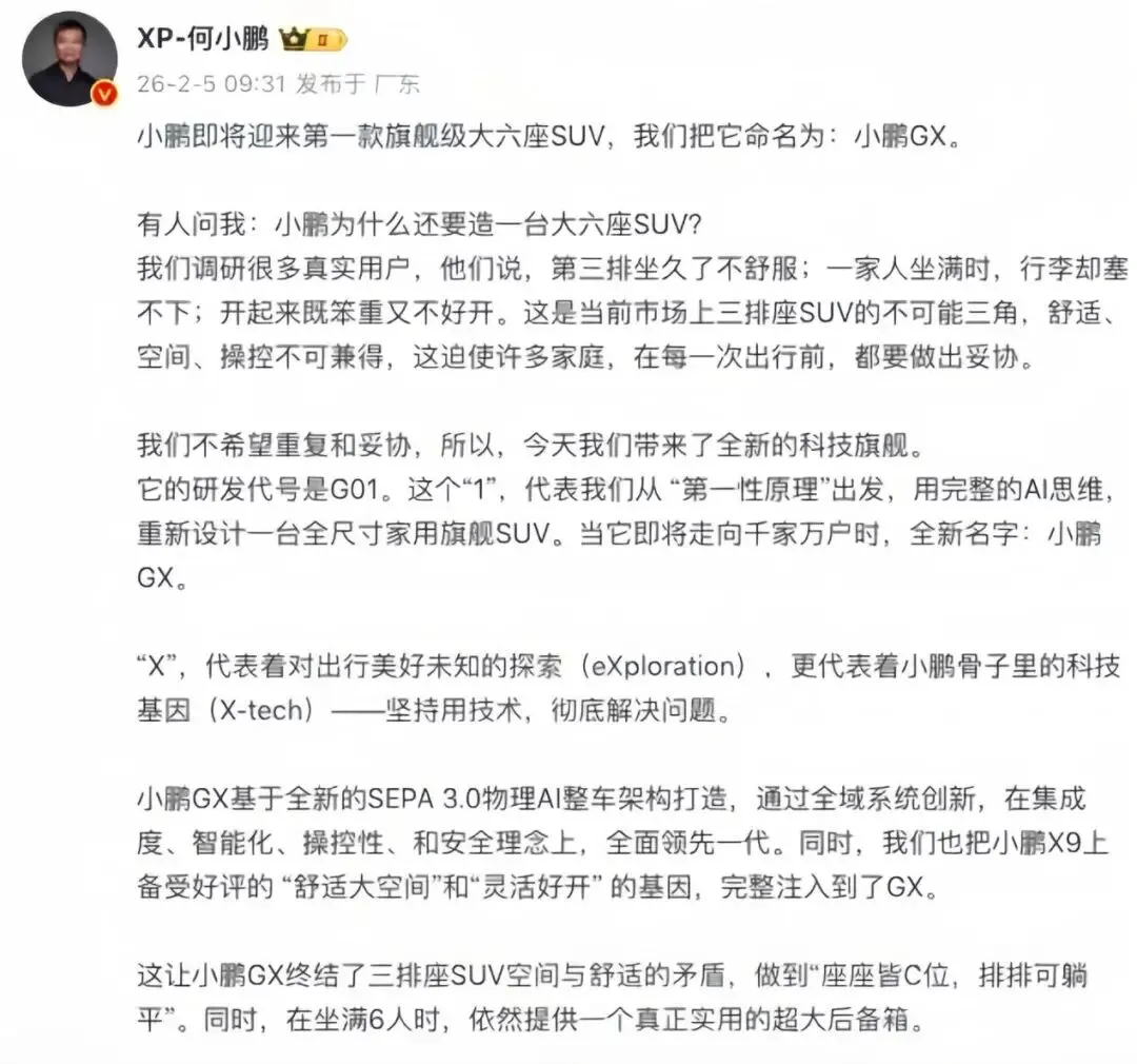 2026年2月5日,小鹏汽车创始人何小鹏在社交平台正式官宣,品牌首款旗舰级大六座SUV——小鹏GX正式发布,同步曝光新车官方图片。小鹏GX定位“AI新豪华大六座SUV”,基于全新SEPA 3.0物理AI整车架构打造,搭载由线控转向与后轮转向系统构成的AI底盘。