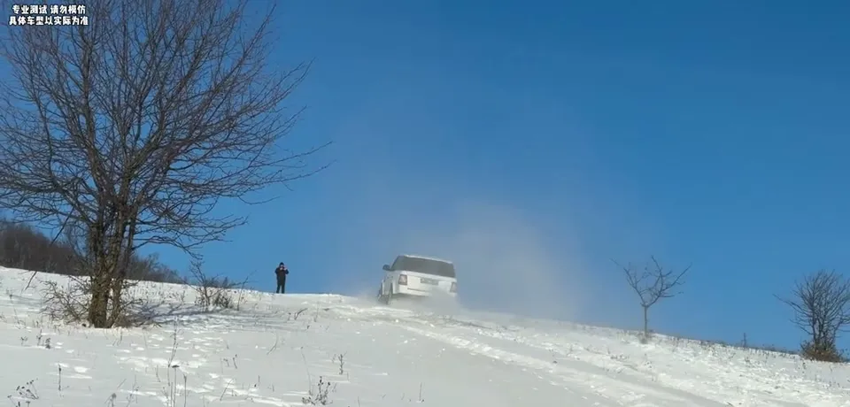 第二代揽胜运动版爬雪坡,在爬到半山腰的位置,轮胎开始打滑,挑战失败。