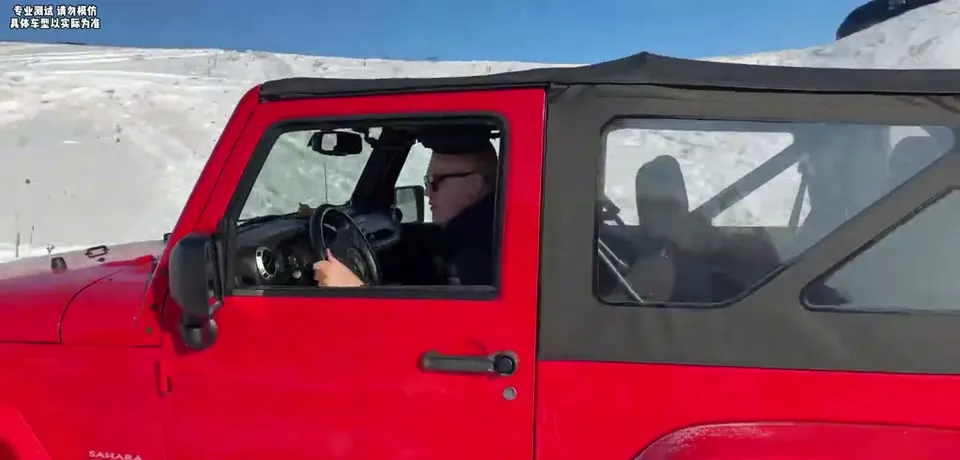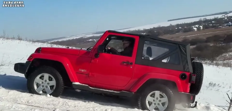 吉普牧马人爬雪坡,由于轮胎打滑而挑战失败。