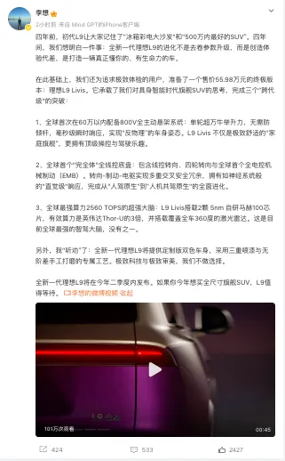 理想汽车创始人李想也在个人社交网络平台发表了介绍。