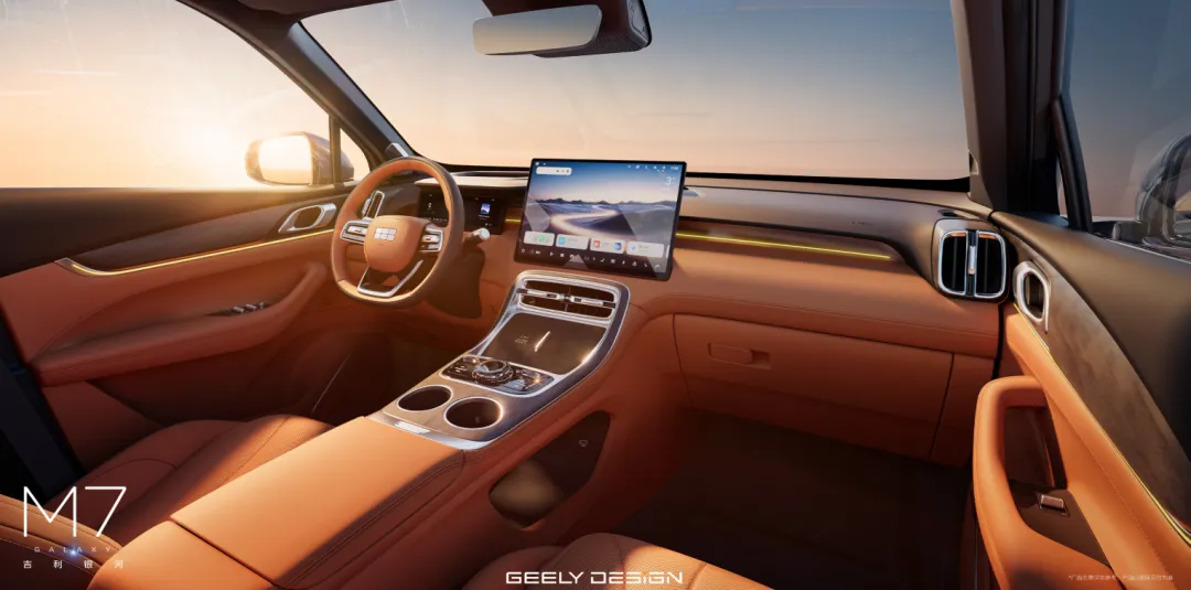 内饰方面,银河M7采用上下双色设计,提供3种内饰配色,搭配多处细节的镀铬元素,营造出较强的质感。新车采用全液晶仪表、悬浮式中控屏、三辐式多功能方向盘,并在中控台岛台处加入木纹饰板以及水晶元素,有着不错的精致感。