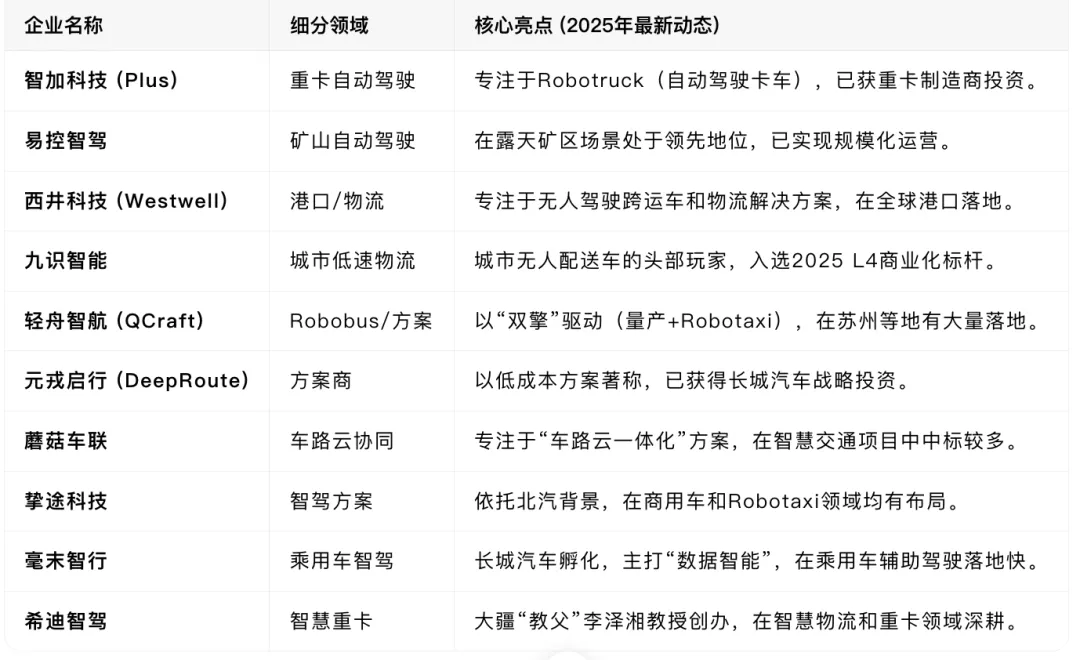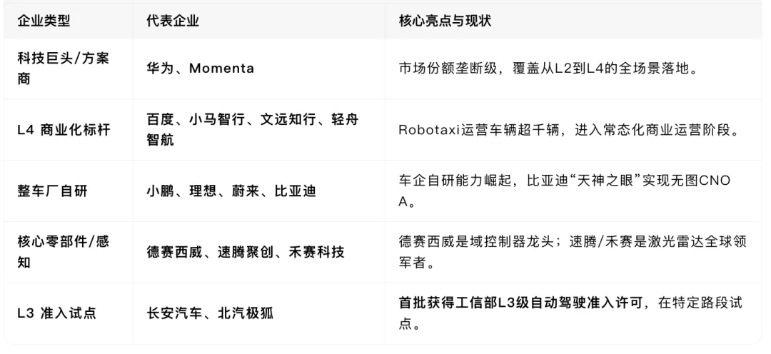 目前已公布L3规模上车、内部测试进展的主机厂还包括广汽、华为、长安汽车、智己、岚图、小鹏汽车、一汽-大众等。根据2025年的市场数据,行业头部效应非常明显,主要分为以下阵营:这几家企业的技术已经实现了大规模的商业化落地,占据了绝大部分市场份额。华为(乾崑智驾):凭借全栈自研技术,其ADS系统在城市NOA(自动辅助导航驾驶)市场占据主导地位,合作车型包括问界、智界等。Momenta:市场份额极高(城市NOA第三方市场份额超60%)。它最大的特点是“两条腿走路”,既做量产L2,又做L4,通过数据飞轮效应快速迭代技术,合作伙伴包括比亚迪、奔驰等。这些企业在特定领域(如Robotaxi或造车新势力自研)有深厚积累,但市场份额和技术成熟度与第一梯队尚有差距。百度Apollo/萝卜快跑:国内布局最早,目前在L4商业化运营方面非常活跃。小马智行 (Pony.ai) & 文远知行 (WeRide):在Robotaxi领域处于领先地位,已在全球多地获得运营资质。造车新势力(蔚小理):蔚来、小鹏、理想等车企在自研智驾系统上表现突出,例如小鹏的XNGP和理想的AD MAX系统。包括大疆旗下的卓驭(以性价比和传感器技术见长)以及众多尚未形成规模化商业落地的初创公司。这些企业在特定场景(如矿山、港口、末端物流)或特定技术路线上非常强势。