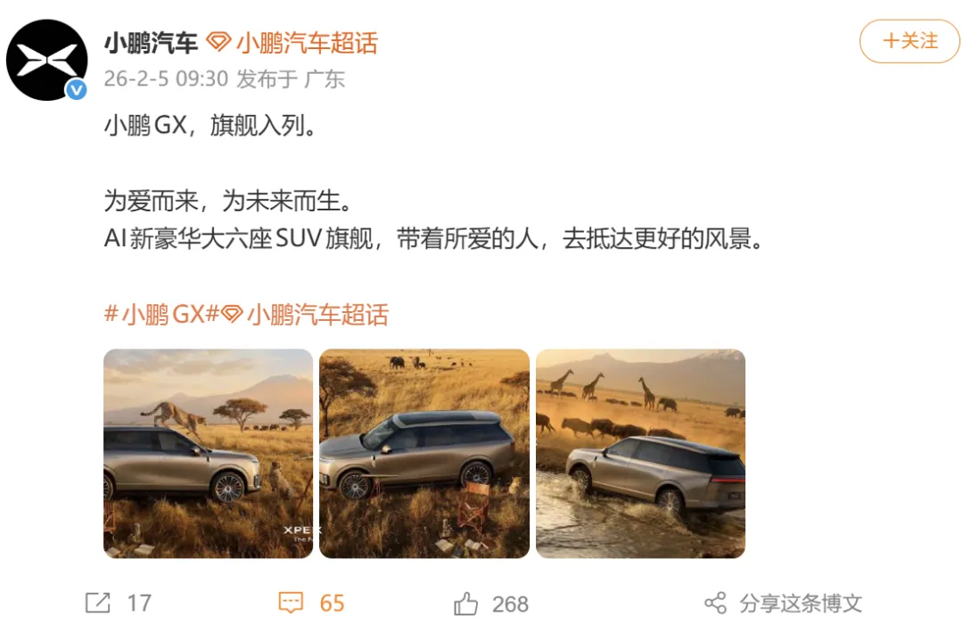 2月5日,小鹏汽车对外发布全新旗舰SUV车型官图,并将新车定名为——小鹏GX。小鹏汽车表示,新车基于全新的SEPA 3.0物理AI整车架构打造,定位AI新豪华大六座SUV旗舰,搭载线控转向和后轮转向的AI底盘。小鹏汽车董事长、CEO何小鹏解释,新车研发代号为G01,“1”代表从“第一性原理”出发,用完整的AI思维,重新设计一台全尺寸家用旗舰SUV;“X”代表对出行美好未知的探索(eXploration),更代表小鹏骨子里的科技基因(X-tech)——坚持用技术,彻底解决问题。