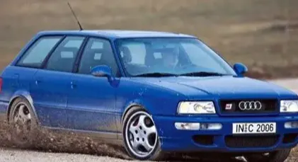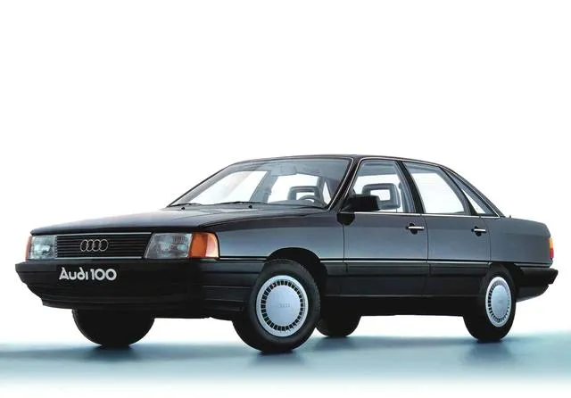 这个黑色宣传图里的版本更早,车身更瘦长一点,车标“Audi 100”直接印在前杠角上,挺招眼,销售员当年拍着胸脯说,全铝发动机盖轻得跟家里铝盆似的,抬起来不费劲,关上去咔哒一声,密封条贴得死实,雨天跑高速,外头再吵,车里只剩风扇的呼呼声。