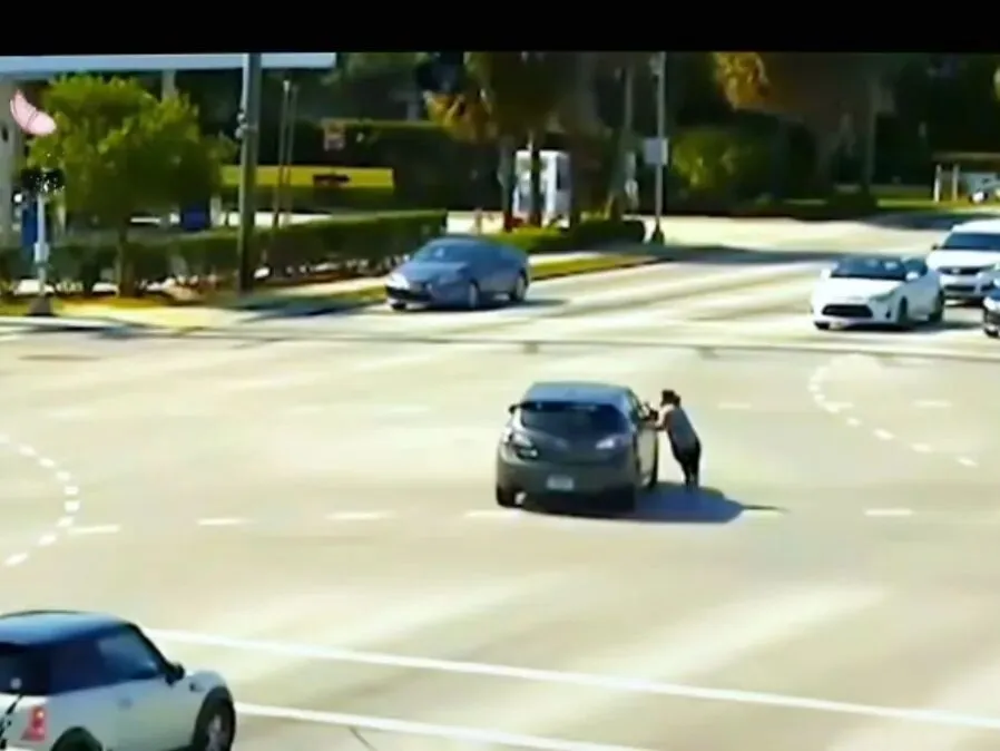 危急时刻,一名女子从银色轿车冲下来,一边拼命奔跑阻拦过往车辆慢行,一边冲到溜车轿车旁拍窗呼喊,可车里的驾驶员毫无回应,车子还在不断向前滑,女子急得不停挥手,让前方车辆赶紧避让,情况眼看着就要失控!