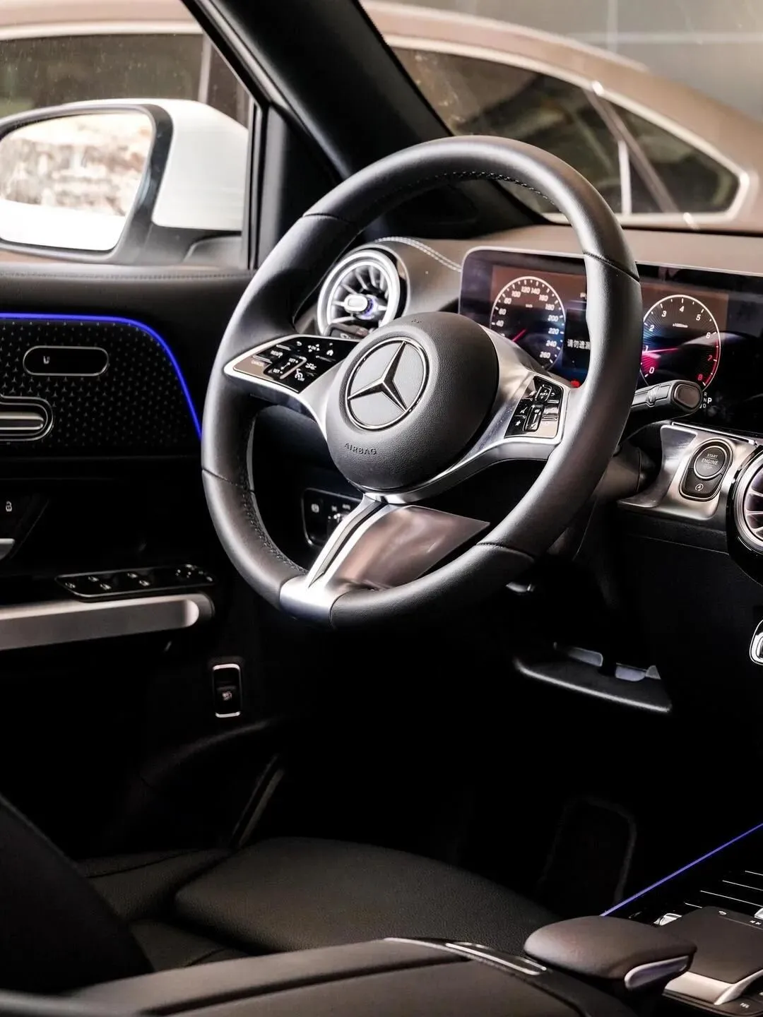 然后咱.进入.车里。内饰这.块儿,是奔驰.的强项.对吧,但我.一坐进现.款GLB,我又开始.挑刺了,这个主.驾门板.上半部.分是真.皮,下半.部分.就一块.硬塑料,
