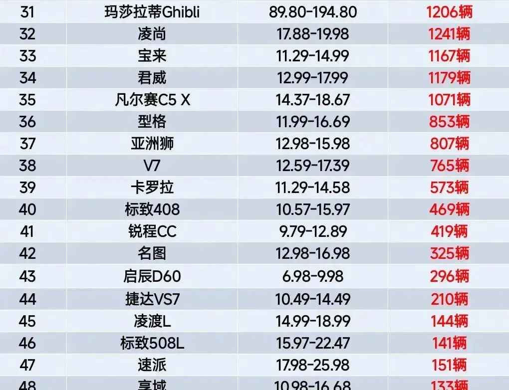 再看那些销量惨淡的,比如玛莎拉蒂Ghibli卖1206辆排第三十一。不是车不好,是价格太离谱。普通人谁一个月能啃下30万?反而红旗H5这种14万左右的车,现在成了隐形黑马。身边一个开出租车的哥们儿,直接把红旗H5当营运车,他说:“油耗低、故障少,一个月多赚两百块,这不就是赚来的?”