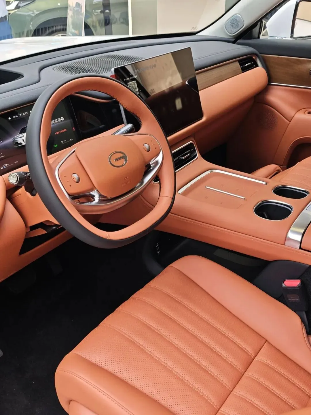 我打开.车门那一刻,第一感觉是——这个内饰用.料,比我预.期的豪华。软性包.覆挺多的,然后方向.盘是一.个三幅.式的平底造型,包裹感不错。中控屏幕很大,但UI我.个人觉得稍.微有点.花。操作.逻.辑需要一点时.间适应。然后我.这里.用手敲了.一下下中.控下沿,嗯,有一点空,可能是用料省了一点,但不影响整体质感。主副驾座.椅都挺宽,用的皮料支撑性.也还行,肩部填充我比较喜欢,就是靠背调节.速度有点慢。