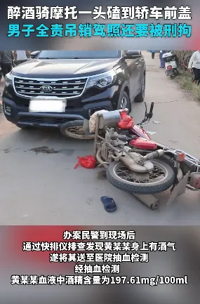 >男子醉酒骑摩托一头磕到轿车前盖,交警:全责,吊销驾照并刑拘