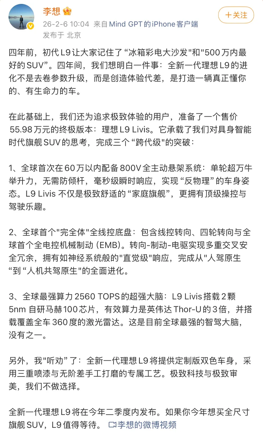 我们抛开对于理想汽车的固有印象来说,现款L9的各项硬件水平的确是落伍了,特别是底盘/驾驶感受更是差强人意。但是换代车型单从硬件层面来看,是绝对顶级的存在,包括智驾和底盘,再也不是只有“彩电三件套”的产品了。不论汽车如何发展,底盘和驾驶还是应该排在第一位的,而这一次理想终于走对了方向。