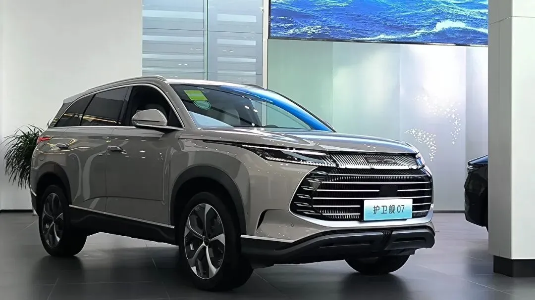 护卫舰07诞生于2023年那个新能源SUV井喷的年代,彼时比亚迪刚刚完成对燃油车的"切割手术",全面押注电动化让这家企业底气十足。作为军舰系列的旗舰级产品,护卫舰07从命名到设计都透着股"硬汉"气质——方正车身、竖向灯组、粗壮防擦护板,这些元素拼凑出一副想要对标丰田普拉多的野心。初期指导价20.28-28.98万元,配合DM-i超级混动技术和非承载式车身,市场反响一度火热。销量数据显示,上市前三个月单月交付量稳定在8000台以上,甚至一度跻身中型SUV销量前十。