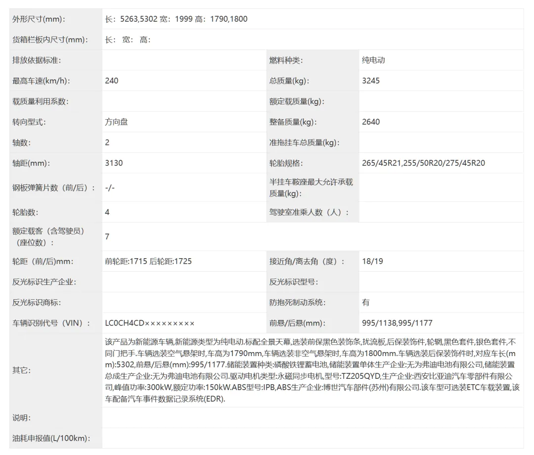 这已经是妥妥的全尺寸SUV级别轴距了,比很多MPV都大。这种尺寸做三排,空间基本不用担心,第三排大概率是真能坐人的那种,不是“应急小板凳”。一台这么大的七座SUV,还能给到这个动力储备,说实话已经不算“买菜车思路”了。纯电大块头能跑到这个速度,说明电驱系统和整车性能取向,是偏强悍那一挂的。这明显不是省电小胎路线,而是稳定性、抓地力、质感优先。能上空气悬架,基本就代表这车的定位不会低,舒适性和高级感肯定是主打方向。电池方面,用的是大家熟悉的磷酸铁锂电池 + 弗迪体系,比亚迪自家的成熟方案,核心就是稳定、安全、寿命长。另外像ABS博世IPB、EDR事件记录系统、全景天幕、各种外观套件可选,这些也都在配置表里。至于它最后会挂在哪个系列、叫什么名字,现在还不好说,但单看工信部这些硬参数,这规格已经是比亚迪家族里的“大哥级”选手了。