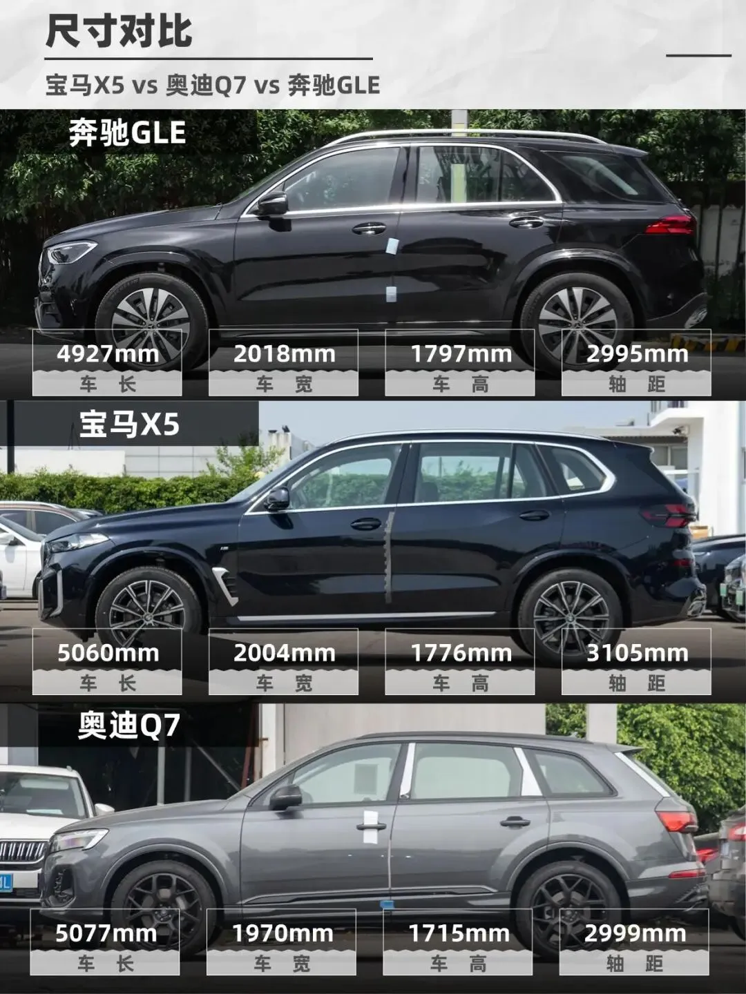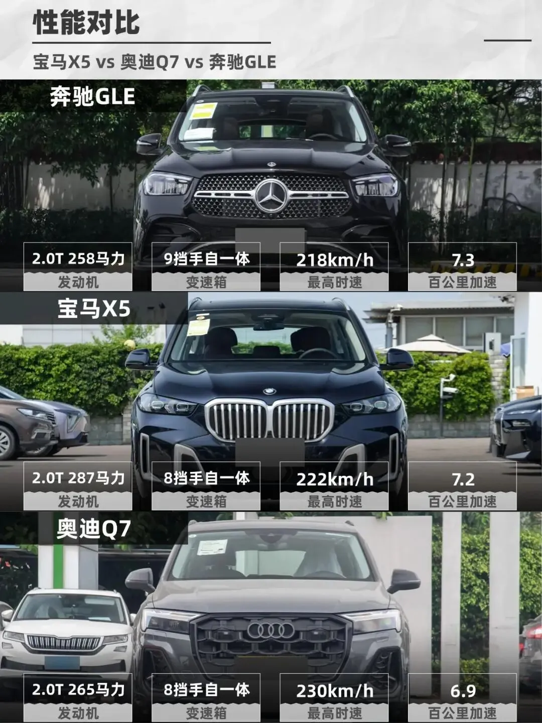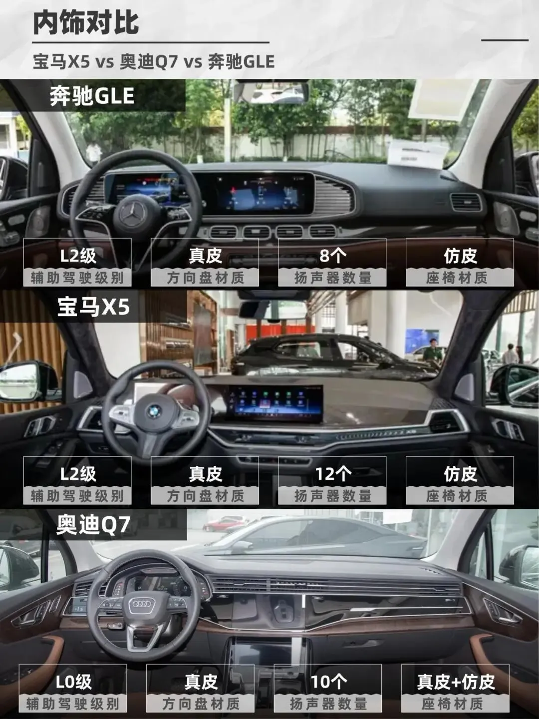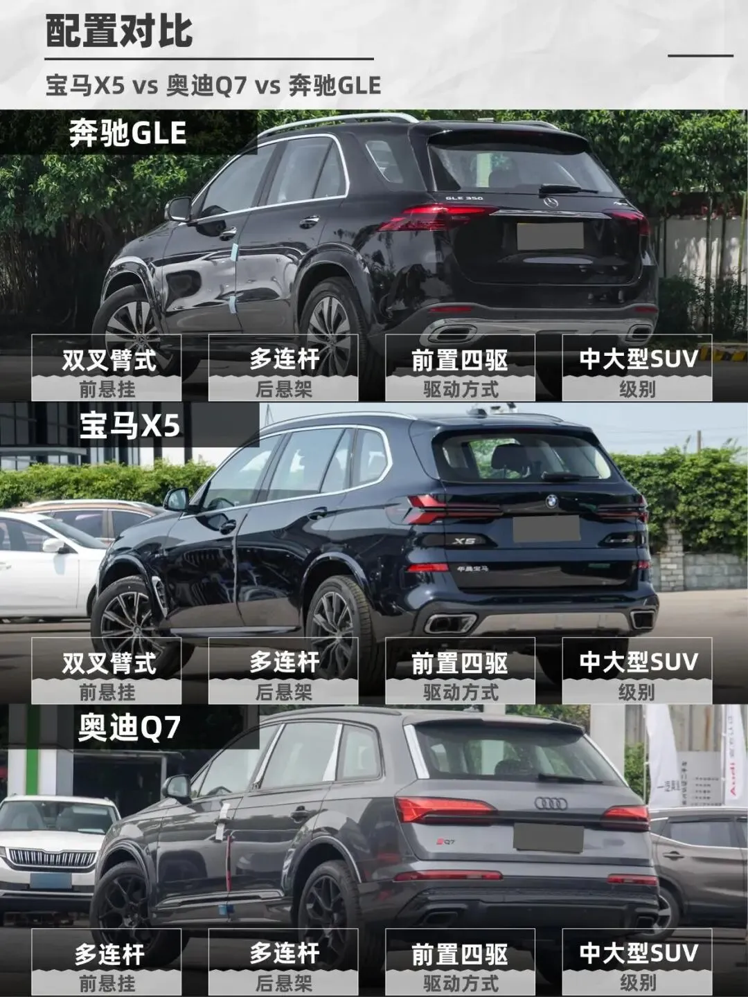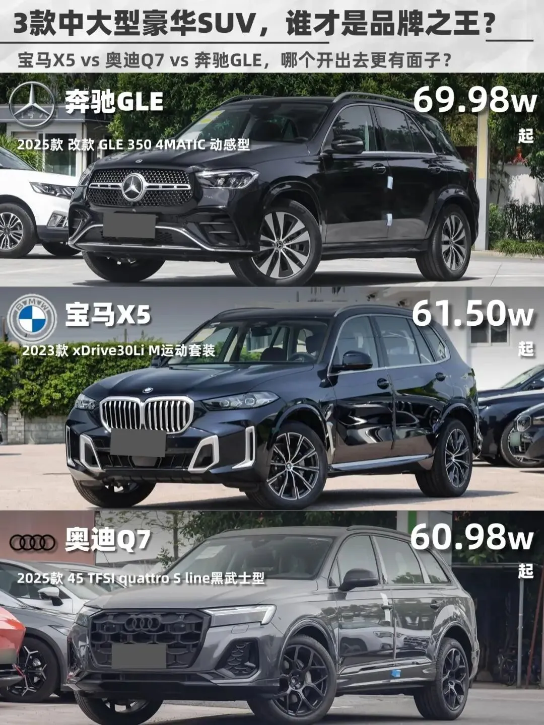 BBA三巨头——宝马X5、奥迪Q7、奔驰GLE,到底谁更值得冲?今天就来聊聊这三款车谁开出去更有排面!宝马X5运动感拉满,双肾格栅+犀利大灯,年轻人最爱!但X5的“猪鼻子”设计争议挺大,有人爱死,有人嫌丑。 奥迪Q7稳重大气,但被吐槽像“大号Q5”,辨识度一般。 奔驰GLE优雅商务范儿,AMG套件一上,气场直接拉满,老板们最爱!宝马X5国产后价格降了,50多万就能开走,但“蓝天白云”标依然硬气,销量吊打Q7和GLE。 奥迪Q7现在疯狂降价,3.0T版本40万多万就能拿下。 奔驰GLE最贵,60万起,但开出去就是“尊贵”,社交属性拉满,适合不差钱的大佬。X5操控YYDS,3.0T+48V轻混,开起来像性能车! ▶️总结: 要运动+销量选X5,要性价比冲Q7,要面子无脑GLE!你认为呢?#我的满分车 #bba #宝马 #奔驰 #奥迪 #小红书车评 #选车攻略 #suv #新手选车 #宝藏新车