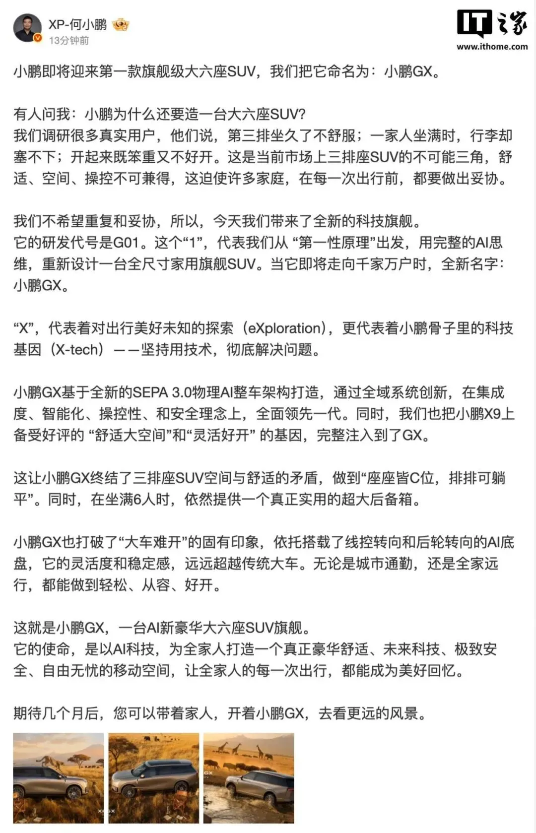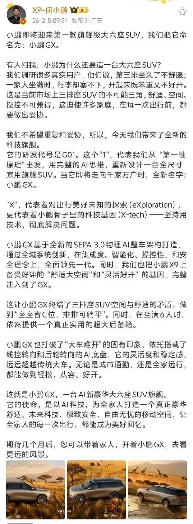 “小鹏即将推出第一款旗舰级大六座SUV,名字叫小鹏GX,研发代号G01。这个‘1’,代表我们从‘第一性原理’出发,用完整的AI思维,重新设计一台全尺寸家用旗舰SUV。”
