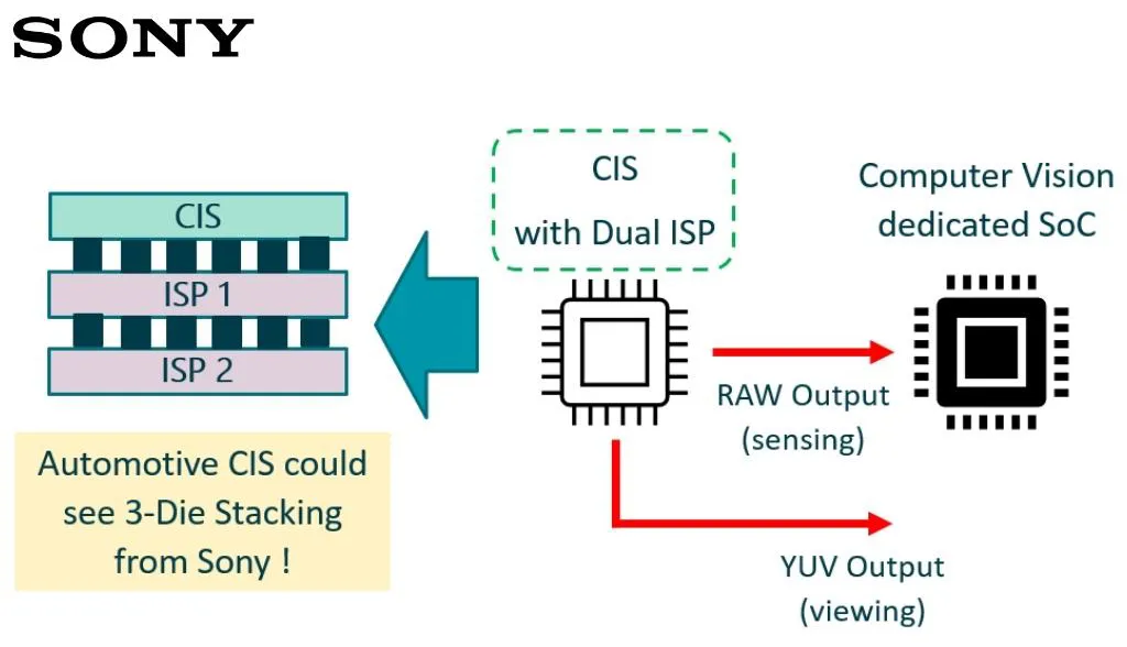 图1 Fuji传感器架构工作流在输出方面,索尼探讨了如何优化图像格式以适应汽车应用,即同时生成RAW和YUV输出,既用于传感又用于查看。目前,图像传感器RAW处理流程的输出针对计算机视觉(传感)进行了优化。而针对YUV色彩感知编码的图像处理则在下游完成,且使用的是RAW输入,这并非最佳选择。通过为RAW和YUV图像处理分别集成单独且专用的ISP芯片,可以独立处理图像,提高每种用例下的图像质量,并为多种用例标准化相机系统架构。如果采用这种方法,索尼未来的汽车传感器将采用CIS(图像传感器)+ ISP1 + ISP2的三重堆叠传感器结构。