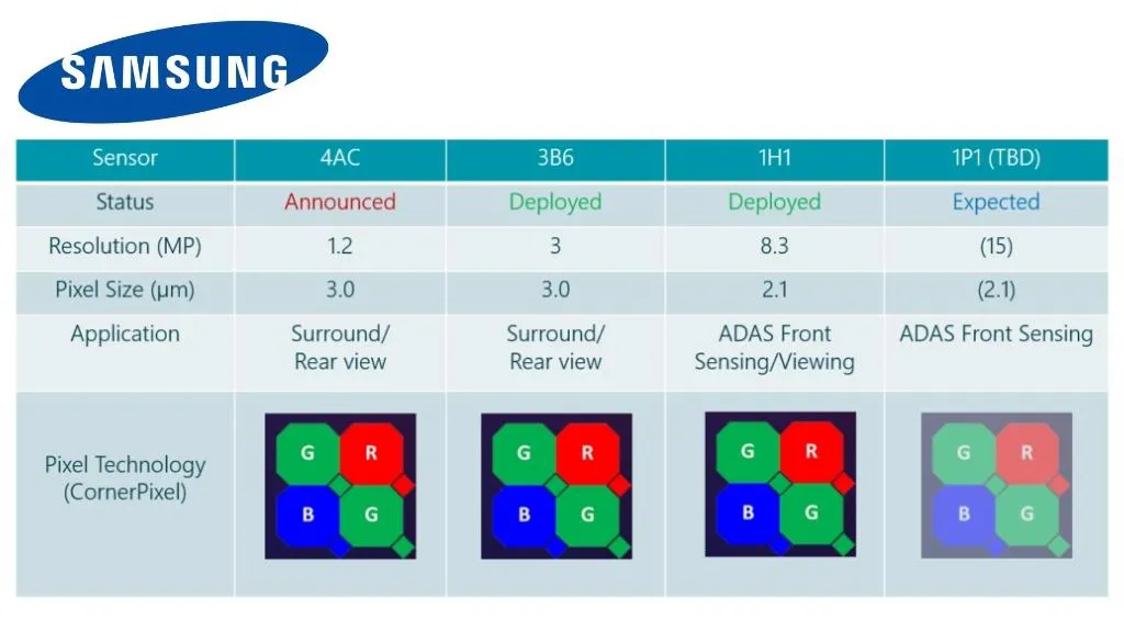 三星展示了两种传感器。其中一种是3B6,这是一种300万像素(1920 x 1536)RGB图像传感器,像素间距为3微米,用于全景视图;另一种是分辨率更高的830万像素(3840 x 2160)RGB传感器1H1,像素间距更小,为2.1微米,用于前方感知和观察应用。这两种传感器均采用了三星的分体式光电二极管“CornerPixel”架构,