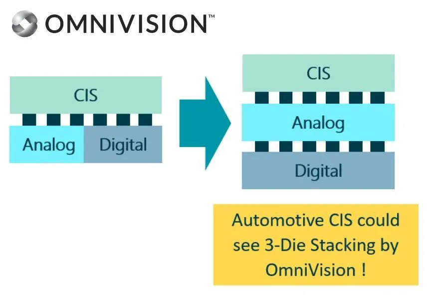 为了实现这一功能,OmniVision还预测了图像传感器集成度的提高,以及从当前的ISP芯片同时集成模拟和数字电路的2芯片堆叠成像器,向模拟和数字逻辑分离到专用芯片的3芯片堆叠的转变。这将优化每个芯片的工艺技术,同时减小芯片尺寸和功耗。