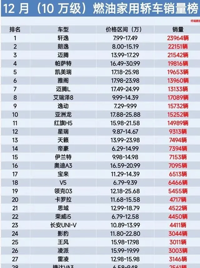 逛汽车论坛翻到10万级燃油轿车的销量单,越看越觉得心里发闷——这哪是销量榜啊,简直是给燃油家轿们摆的“年终考”,考得好的笑不出声,考砸的连哭都嫌没底气,就俩字儿能形容:真惨。