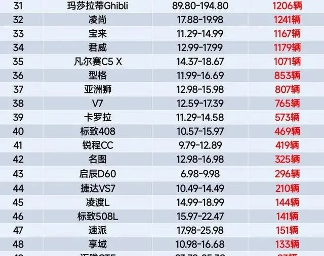 最让人心里咯噔一下的,是那些跌出榜单尾巴的。宝来、君威销量不足1167辆,直接掉到32名外头,想当年宝来也是“驾驶者之车”的代表,现在月销一千多,连自家兄弟速腾都不如;玛莎拉蒂Ghibli1206辆排三十一,虽说它是豪华品牌,但放在10万级燃油轿车的讨论里提一嘴,更显得燃油车市场凉得透——连百万级的豪车都在掉销量,普通家用车能好到哪儿去?V7更夸张,765辆排三十八,4S店的销售说:“现在店里一个月卖不了十台,老板都打算把展车挪到角落积灰了。”