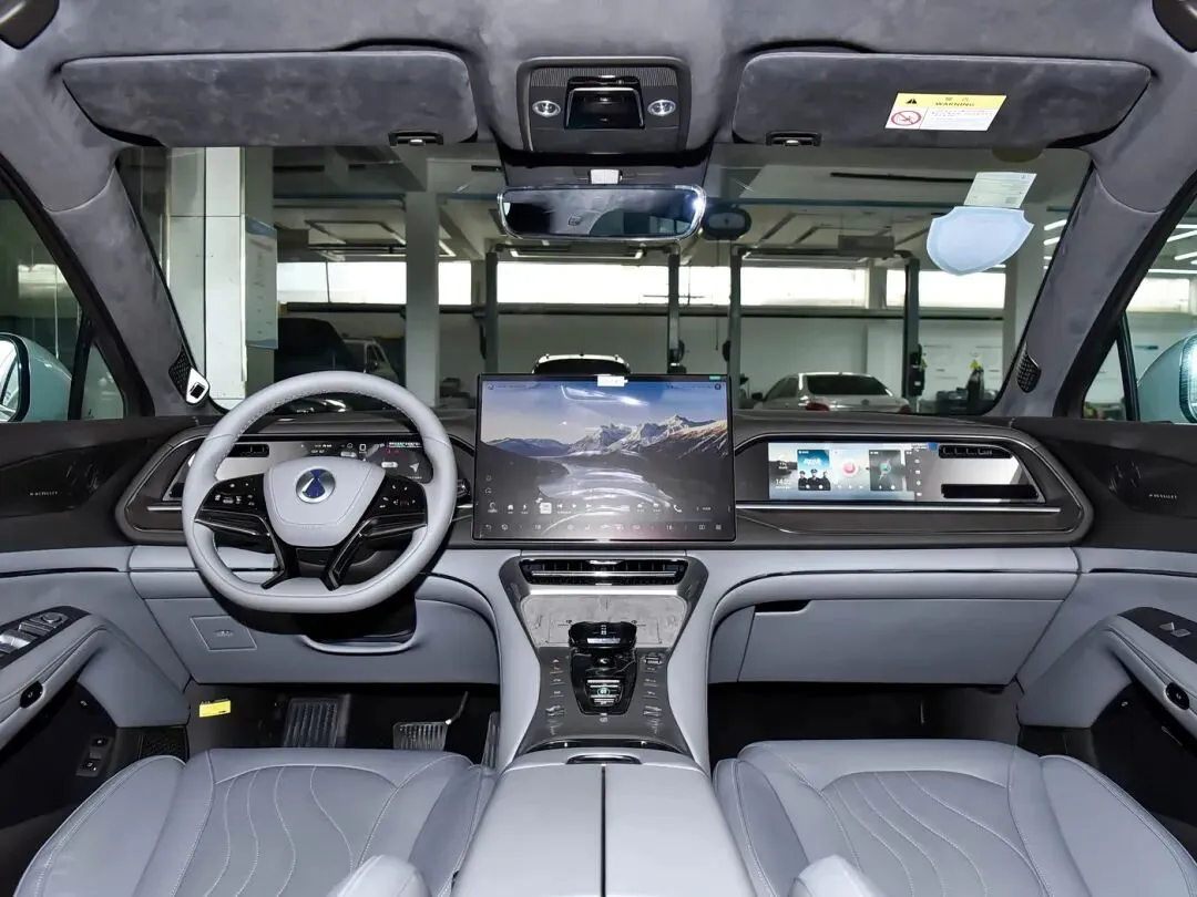 进入车内,内饰设计以“科技豪华、全域舒适”为核心,采用沉浸式座舱布局,配备50英寸AR-HUD+17.3英寸中控屏+10.25英寸副驾娱乐屏+7英寸后排扶手屏的五屏互联系统,搭载定制化6nm工艺芯片,操作流畅顺滑,支持全场景智能语音、AI大模型问答与多车畅联功能。空间布局上,新车采用5门5座布局,基于2940mm长轴距优势,车内空间充裕舒适。前排配备5D云感人体工学座椅,支持14向电动调节、通风、加热与10点式按摩,主驾配备电动大腿托,长途驾驶更舒适。