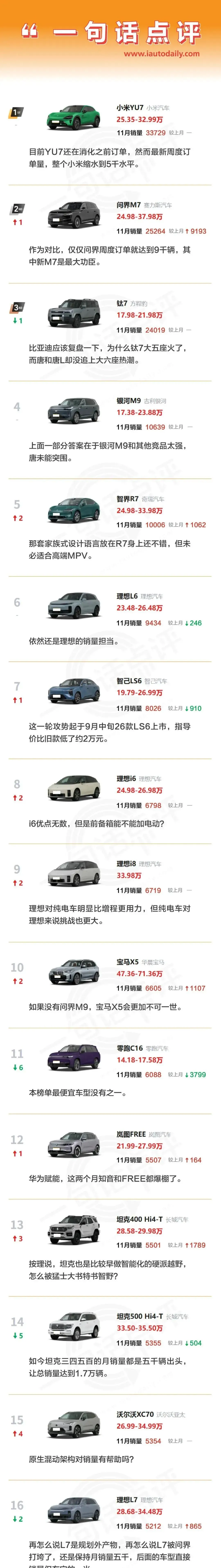 还有一点很多人没注意:11月YU7刚开始交付,产能还没完全爬坡。等12月、1月数据出来,SU7的处境只会更尴尬。