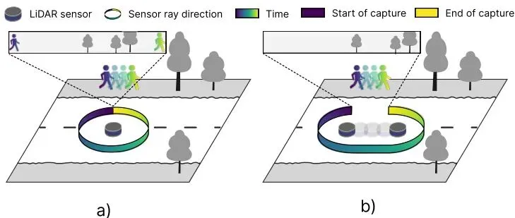 LiDAR可以看作一个球形卷帘快门相机。它一边旋转,一边发射激光束,记录返回的时间和角度,生成一幅360度的“距离图像”。这里的“方位角(Azimuth)”是一个从-π到π(或0到2π)周期性变化的值。问题就出在这个周期性和卷帘快门的时间不连续性上。图4:发生在方位角边界附近的LiDAR不连续性。 a) 即使传感器静止并恰好覆盖360度,由于卷帘快门造成的时间不连续性也可能导致物体被观测两次。 b) 自车运动与卷帘快门结合导致空间不连续性。
