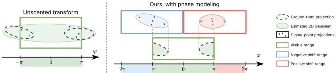 既然问题源于方位角的周期性和UT的单峰假设,那就主动拥抱多峰可能性。XSIM提出的相位建模(Phase Modeling)机制,核心思想是:显式地考虑高斯粒子可能出现在多个方位角周期(相位)的情况。图6:单个高斯粒子横跨滚动快门球形相机的方位角边界 φ=±π 时,会投影成两个独立的具有不同2D协方差矩阵的2D高斯。无迹变换提供了粒子投影的单峰后验近似,导致过大且形状错误的投影。我们的相位建模机制通过考虑从可见范围偏移 ±π 的两次额外投影,实现了双峰2D高斯投影。通过执行偏移半个周期的投影,我们处理了其Sigma点落入多个方位角周期的粒子。