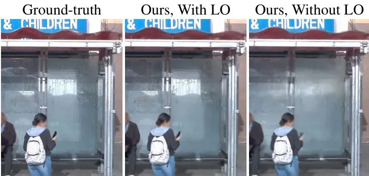 XSIM的解决方案简单又直接:给每个3D高斯粒子配备两个独立的不透明度参数!一个是 σ_c 用于相机渲染,另一个是 σ_L 用于LiDAR渲染。在训练时,这两个参数被联合优化,同时用一个正则化损失 ℒ_opacity 让它们不至于相差太远,保持基本的物理一致性。图5:单独建模LiDAR不透明度(LO)解决了几何与颜色分布的失配,并提高了对于半透明表面和镜面反射的外观建模质量。