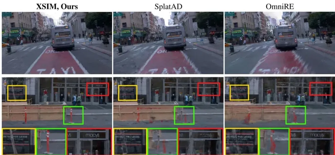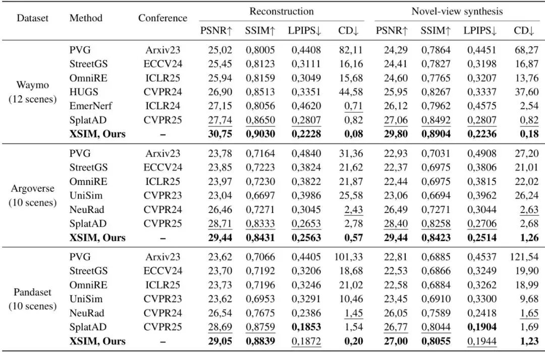 光说不练假把式。XSIM在Waymo、Argoverse 2和PandaSet这三个主流自动驾驶数据集上进行了全面测试,对比了包括SplatAD、OmniRE、NeuRAD等在内的多个近期SOTA方法。结果相当有说服力。表1:三个数据集上场景重建和新视角合成场景的定量结果。我们报告了RGB图像质量指标(PSNR, SSIM, LPIPS)和通过倒角距离(CD)测量的LiDAR重建精度。我们的框架在所有数据集和场景中都达到了最先进的性能,特别是在LiDAR渲染方面实现了误差的大幅降低。