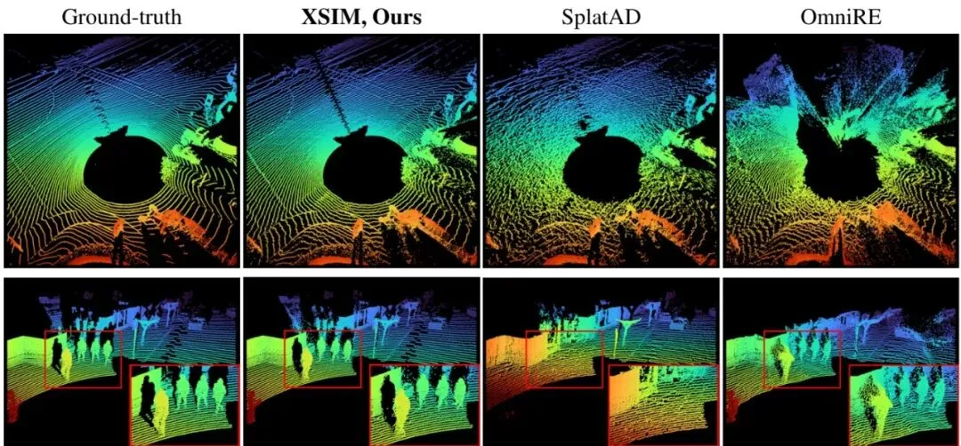 几何精度(LiDAR CD指标):这更是XSIM的杀手锏。在Waymo重建任务中,倒角距离(CD)低至0.08,比SplatAD(0.82)降低了约90%(提升了一个数量级)!在新视角合成任务中也有4.5倍的误差降低。这说明其模拟的LiDAR点云与真实数据在几何上几乎完全一致。图7:LiDAR渲染。不同方法渲染的LiDAR点云对比。先前的方法表现出扭曲的扫描线模式和不完整的几何结构,包括行人等易受伤害的道路使用者。