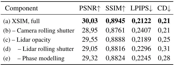 消融实验(表2)也扎实地证明了每个组件的有效性。移除相机卷帘快门建模、LiDAR不透明度分离、LiDAR卷帘快门建模或相位建模机制,都会导致图像质量(PSNR, SSIM)和/或几何精度(CD)的明显下降。这验证了XSIM的设计不是花架子,每一个模块都贡献了实实在在的性能增益。未来展望:更逼真、更高效的仿真之路
