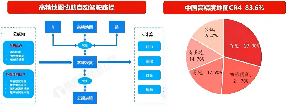 自动驾驶技术对于车道、车距、路牌等信息的依赖程度更高,需要更加精确的位置信息,是自动驾驶车辆对环境理解的基础。随着自动驾驶技术不断进化升级,为了实现决策的安全性,需要达到厘米级的精确程度。如果说传感器向自动驾驶车辆提供了直观的环境印象,那么高精度地图则可以通过车辆准确定位,将车辆准确地还原在动态变化的立体交通环境中。