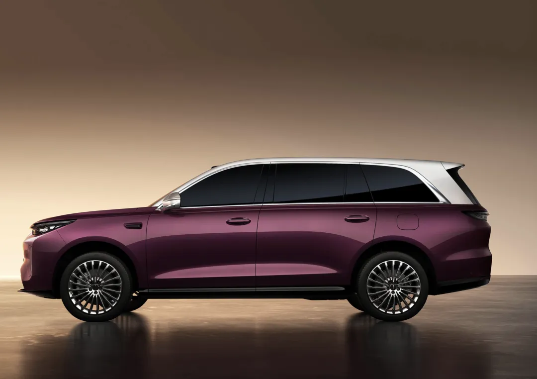 来到车身侧面,魏牌V9X车身采用了大量平直的线条勾勒,倾斜的A柱与近乎于地面平行的车顶巧妙地融为一体,车顶就是一整块全景天幕。车身采用了旗舰SUV惯用的双色车漆涂装,还配备了21英寸的多辐式银色铝合金轮圈,匹配了255/50 R21规格的轮胎,看上去更加气派。车身侧面采用常规造型车门把手,配备了宽大的商务型车门,还有黑色的宽体迎宾踏板设计。尺寸方面,该车的长宽高分别为5299/2025/1825mm,轴距为3150mm,采用6座布局。通过性方面,魏牌V9X的接近角21°、离去角20°,最小离地间隙220mm。在城市通勤,它能轻松应对减速带。在偏远的山区,它也能带你爬山涉水、翻山越岭。既是一款商务接待用车,也是一款不错的越野车。
