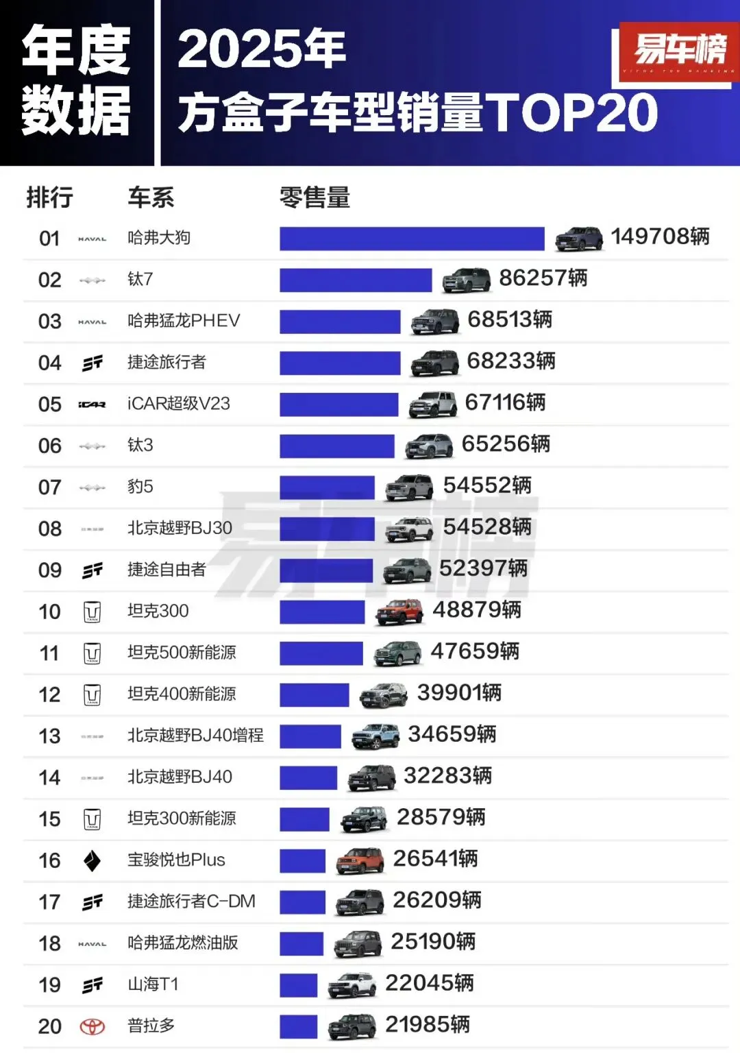 2025年方盒子SUV销量统计,长城占半壁江山.