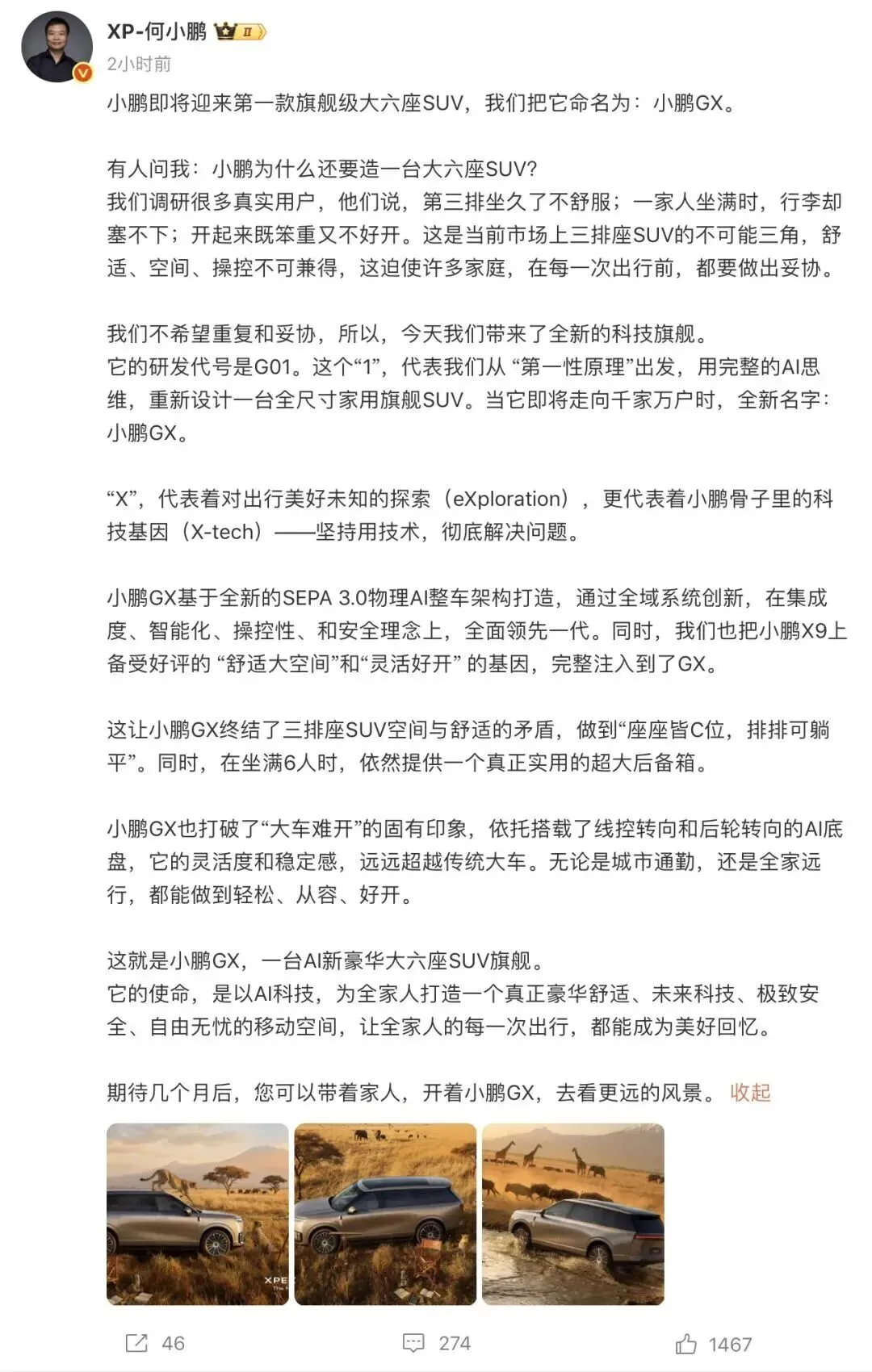 2月5日,一直聚焦5座轿车或中型SUV市场的小鹏汽车,表示将推出首款六座SUV。公司官宣称,首款六座科技豪华旗舰SUV——小鹏GX将正式推出。