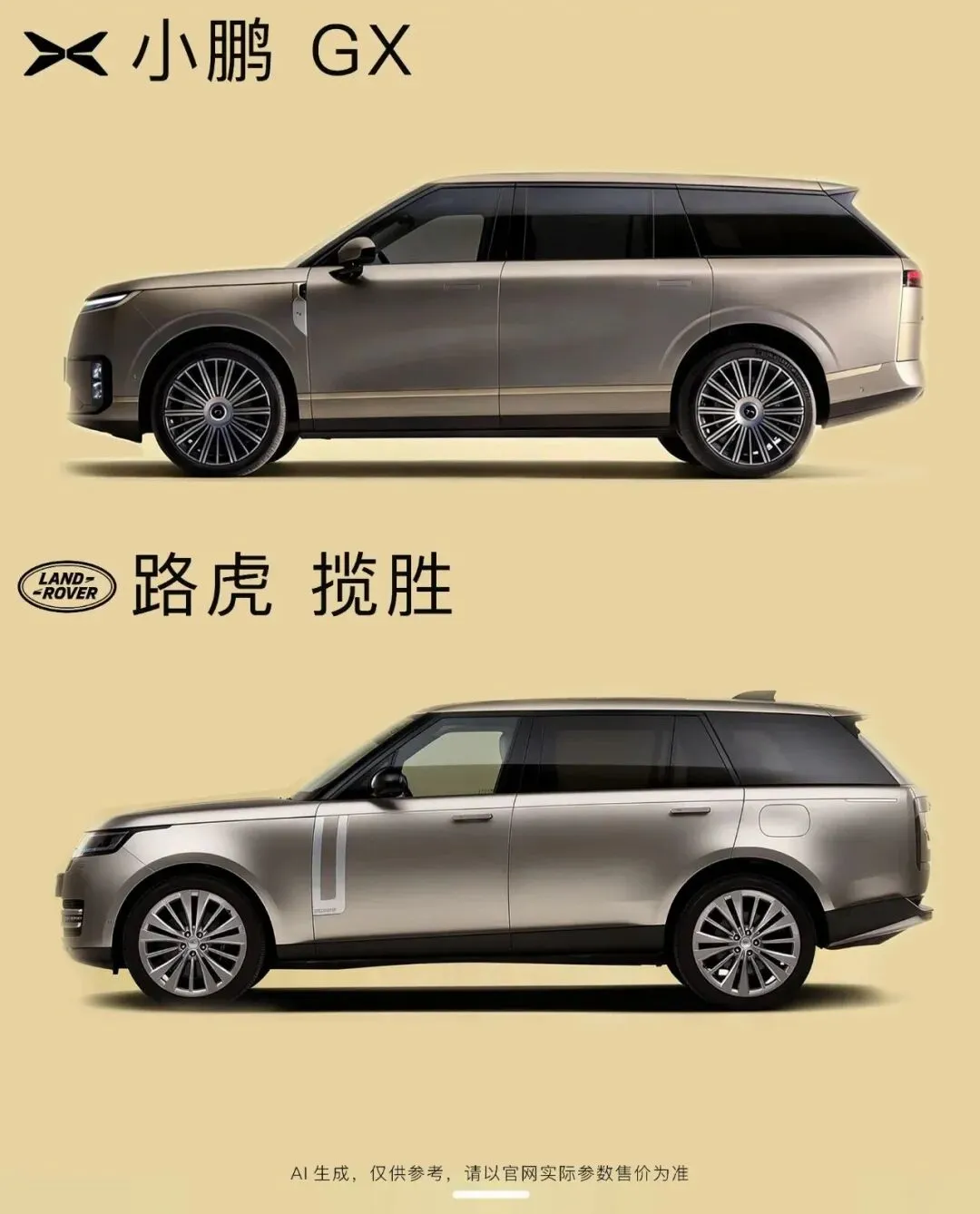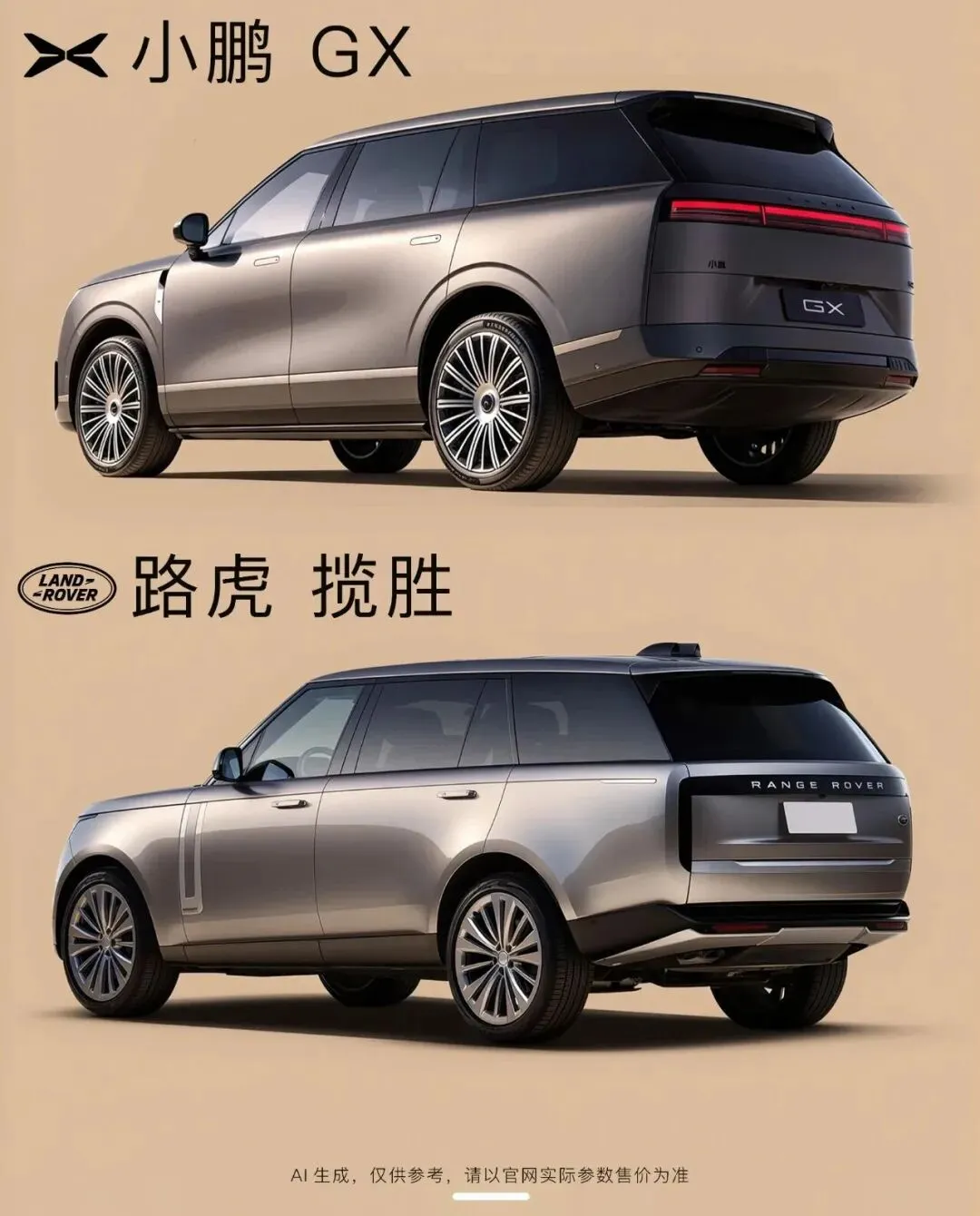 外观上,小鹏GX借鉴了揽胜标志性的设计元素:蚌式机盖、长轴距长后悬的舒展比例,搭配悬浮式车顶与隐藏式门把手,勾勒出沉稳大气的豪华气场,与揽胜的行政级视觉感高度契合,车尾天地门设计更是直接呼应了揽胜的经典细节。
