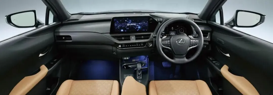 如果说外观是对他人的展示,那么内饰便是与驾驶者朝夕相处的私密空间。新款UX 300h此次改款在内饰氛围的营造上可谓下足了功夫。最引人注目的升级之一是全系新增了64色可调的氛围灯系统。这不仅仅是简单的颜色数量增加,更意味着座舱情绪的可定制化。无论是寻求宁静的蓝色,还是激发活力的红色,驾驶者都能根据心情或场景自由切换,让每一次出行都伴随独特的光影韵律。与此同时,工程师们并没有忽视实用性的照明。新车针对前排座椅脚部空间以及中央扶手箱内部的照明亮度进行了显著提升。这个小改动看似微不足道,却在夜间或地下车库等光线不足的环境下,极大提升了寻找物品的便利性与座舱的高级感,体现了日式设计中对人性化关怀的极致追求。更值得一提的是,对于选择version L车型并搭配“Solis White”(日光白)内饰的用户,车顶颜色也会同步调整为同色设计。这种从座椅、中控到车顶的色调一体化处理,营造出更为纯净、开阔且高级的座舱视觉整体性,让豪华感渗透于每一个角落。