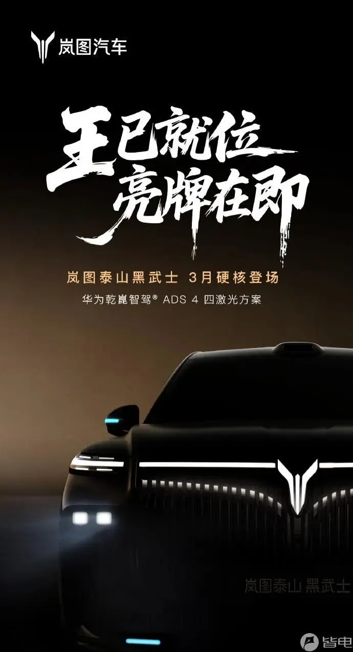 2月9日,岚图汽车董事长卢放在微博中发文称:3月,中国首款量产L3级大型SUV——岚图泰山黑武士将正式上市。