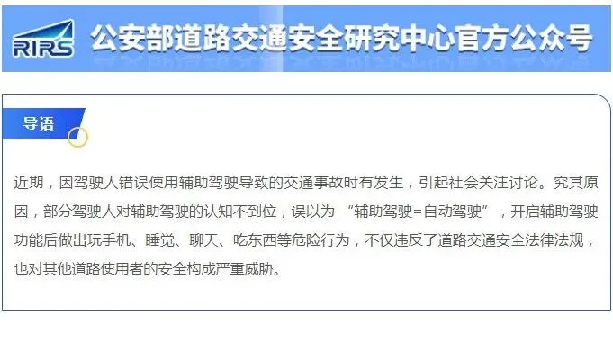 近日,公安部道路交通安全研究中心官方公众号“交通言究社”发表《智慧领航,安全护航 —— 智能网联汽车辅助驾驶功能使用须谨慎》一文。近期,因驾驶人错误使用辅助驾驶导致的交通事故时有发生,引起社会关注讨论。究其原因,部分驾驶人对辅助驾驶的认知不到位,误以为 “辅助驾驶=自动驾驶”,开启辅助驾驶功能后做出玩手机、睡觉、聊天、吃东西等危险行为,不仅违反了道路交通安全法律法规,也对其他道路使用者的安全构成严重威胁。