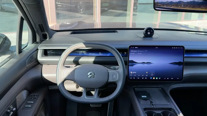 车内无论是造型设计还是颜色搭配,又或者是车内实体按键和盖板开关时的阻尼感,做的都非常的好,它不会给你一种堆料到极致的暴发户味道,反而是给到我一种类似侘寂美学的高级感,克制、稳重、温润……这种感觉和沃尔沃非常像,但和沃尔沃不同的,是蔚来有专属于自己的科技感。
