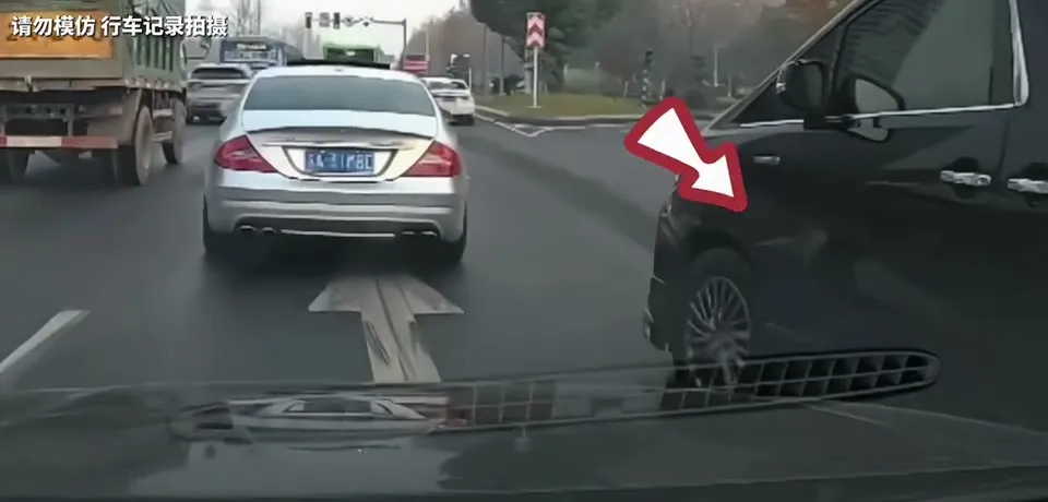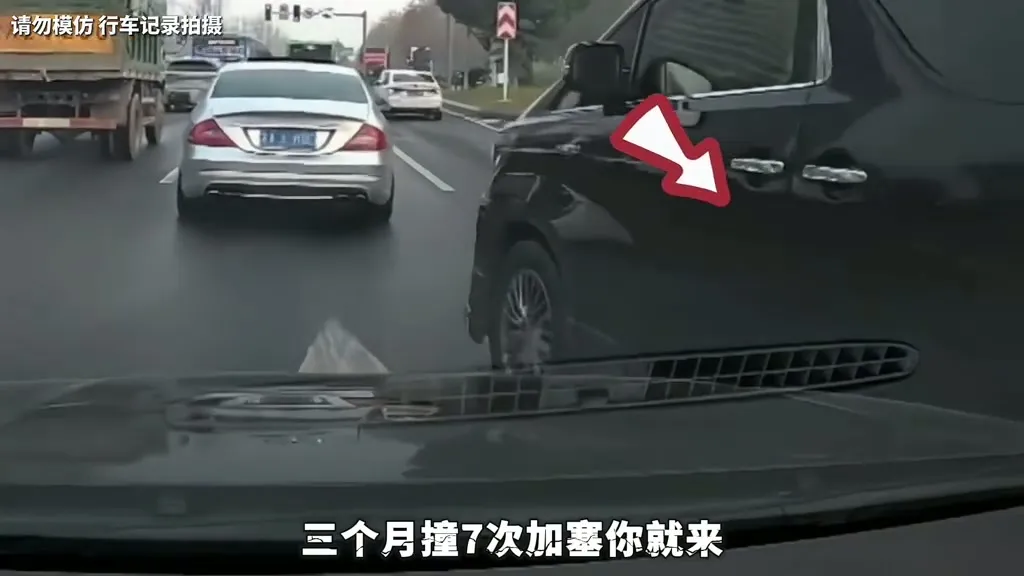 黑色商务车再次试图加塞,被前方车辆抵制。