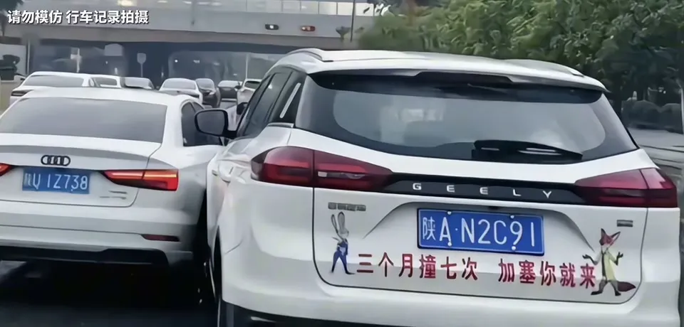 ——就这么一行字,贴在一辆白色吉利SUV的车尾上。
